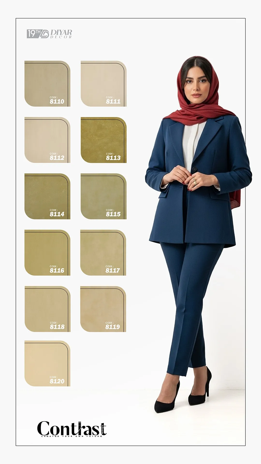 این آلبوم طیف کاملی از رنگ‌های پرکاربرد دکور داخلی را ارائه می‌دهد؛ از طوسی و زغالی گرفته تا کرم، شیری، نسکافه‌ای و خاکی. هر کدام از این رنگ‌ها با بافت‌های برجسته یا مات عرضه شده‌اند تا دیوار کاملاً زنده و متفاوت به نظر برسد.